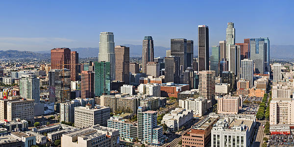 Close up view of the wide panorama of downtown Los Angeles in nice light on a clear day. The ratio of this crop is 12" wide for every 6" in height. This can be printed up to 6 feet long.