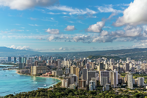 The gorgeous view of Waikiki and Honolulu from the top of Diamond Head Crater. The photograph includes the city skyscrapers, the Waikiki shoreline, blue sky with clouds and Honolulu in the distance.