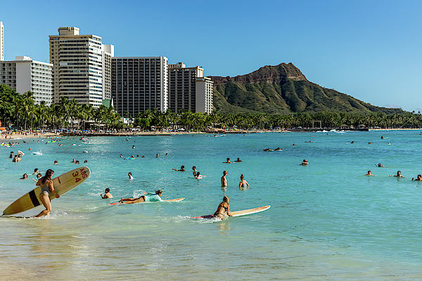 A typical view of the turquoise water at Waikiki Beach with iconic Diamond Head in the distance.